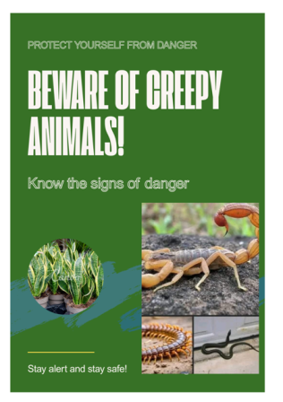 Clear simple warning on lush green background symbolizing vegetation under which these creepies often hide unnoticed.